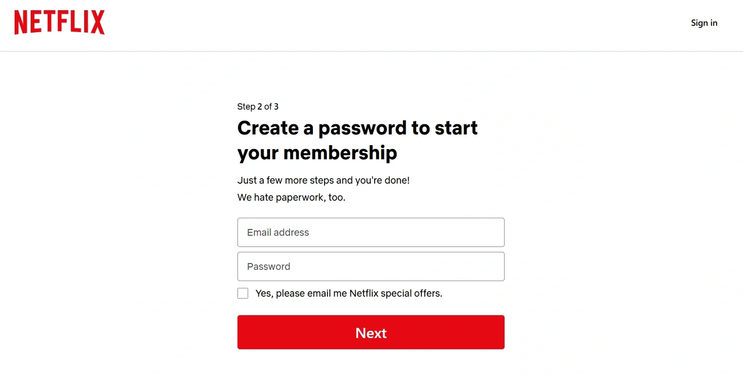 Netflix’s subscription form is short and sweet - just your email and password will do (they can always collect the rest later). Doesn’t this make you much more inclined to sign up?