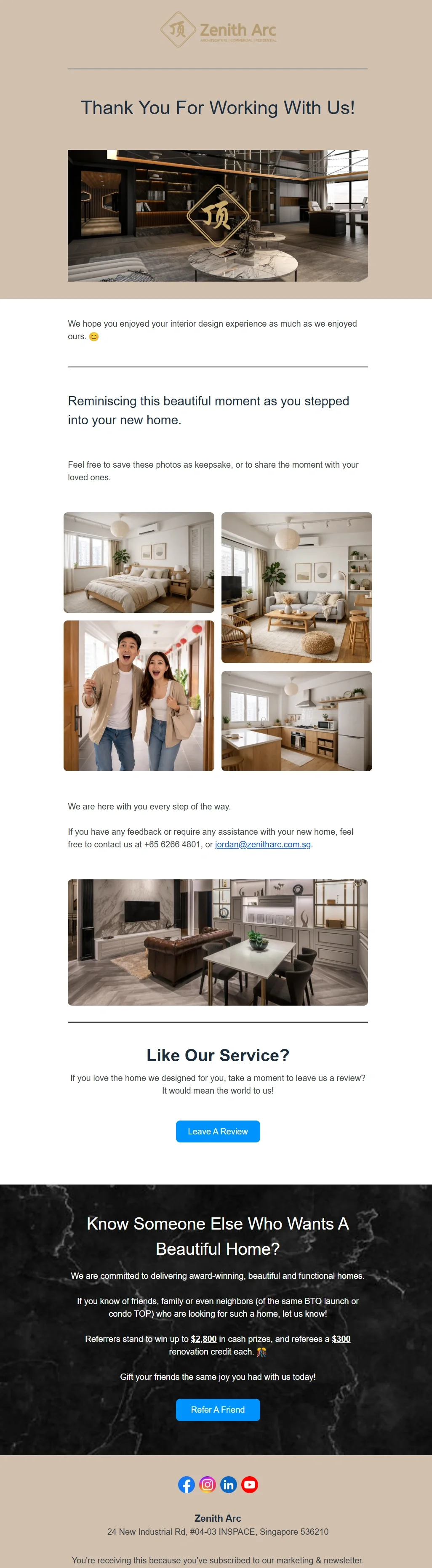 I structured a thank you email to be sent automatically to clients after their home reveal, which is also usually the end of Zenith Arc’s services.